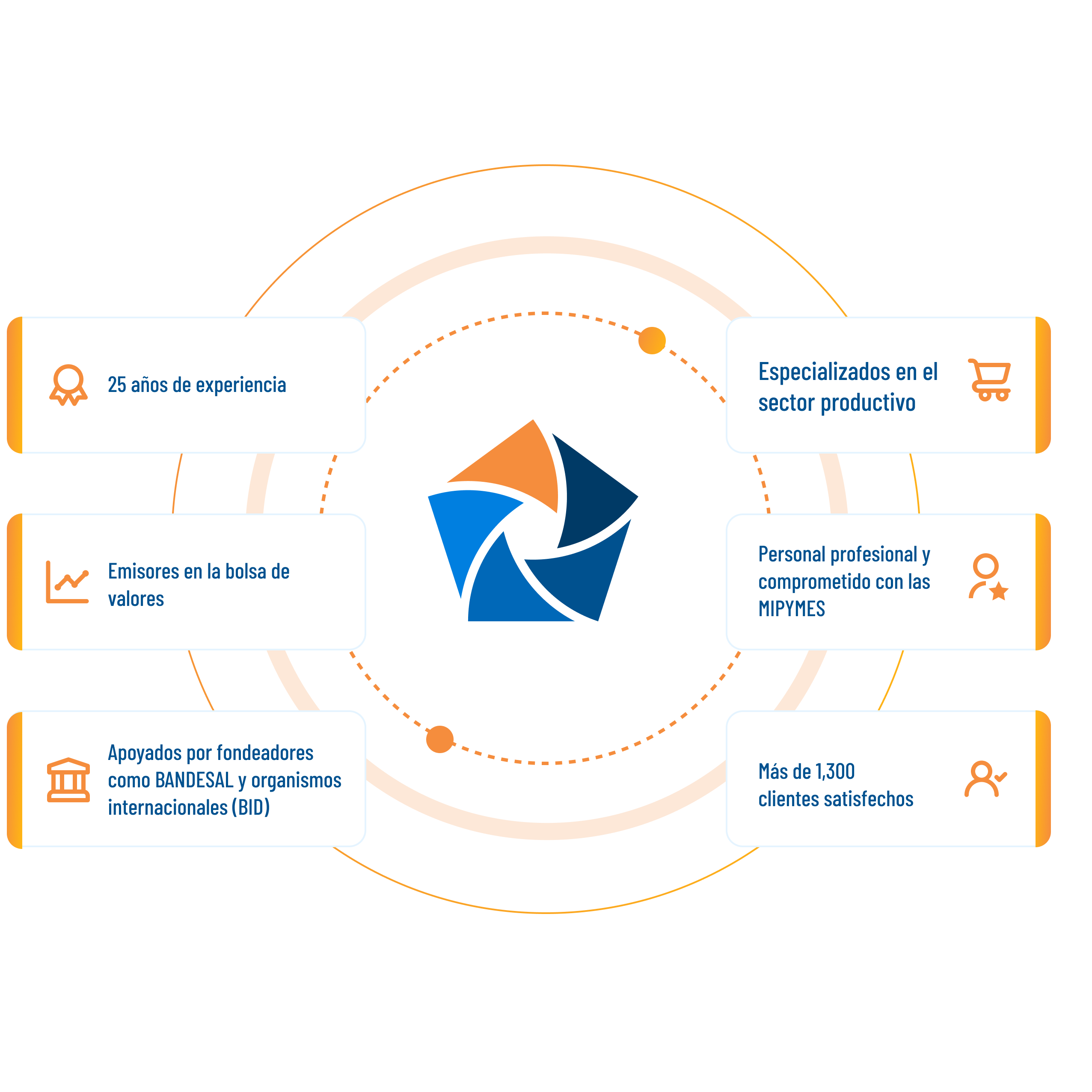 Nuestra solidez y experiencia brindando créditos productivos, nos ha permitido contar con el apoyo de fondeadores tanto nacionales como internacionales y organismos de cooperación, así como también ser emisores de papel bursátil en la Bolsa de Valores, todo lo cual nos permite ofrecer nuestros servicios en favorables condiciones y ser una solución financiera para que las MIPYMES puedan continuar operaciones o invertir en nuevos proyectos.